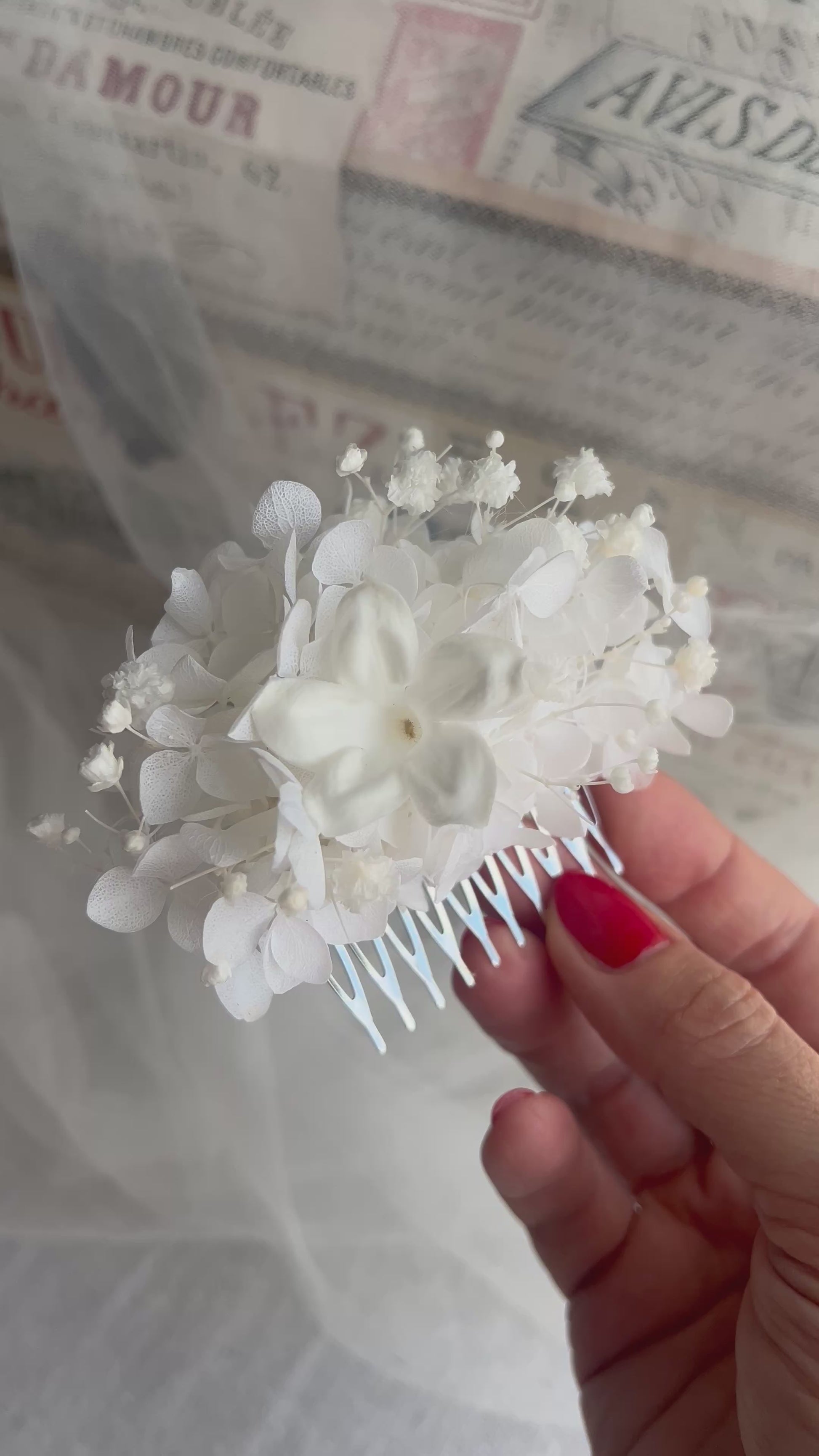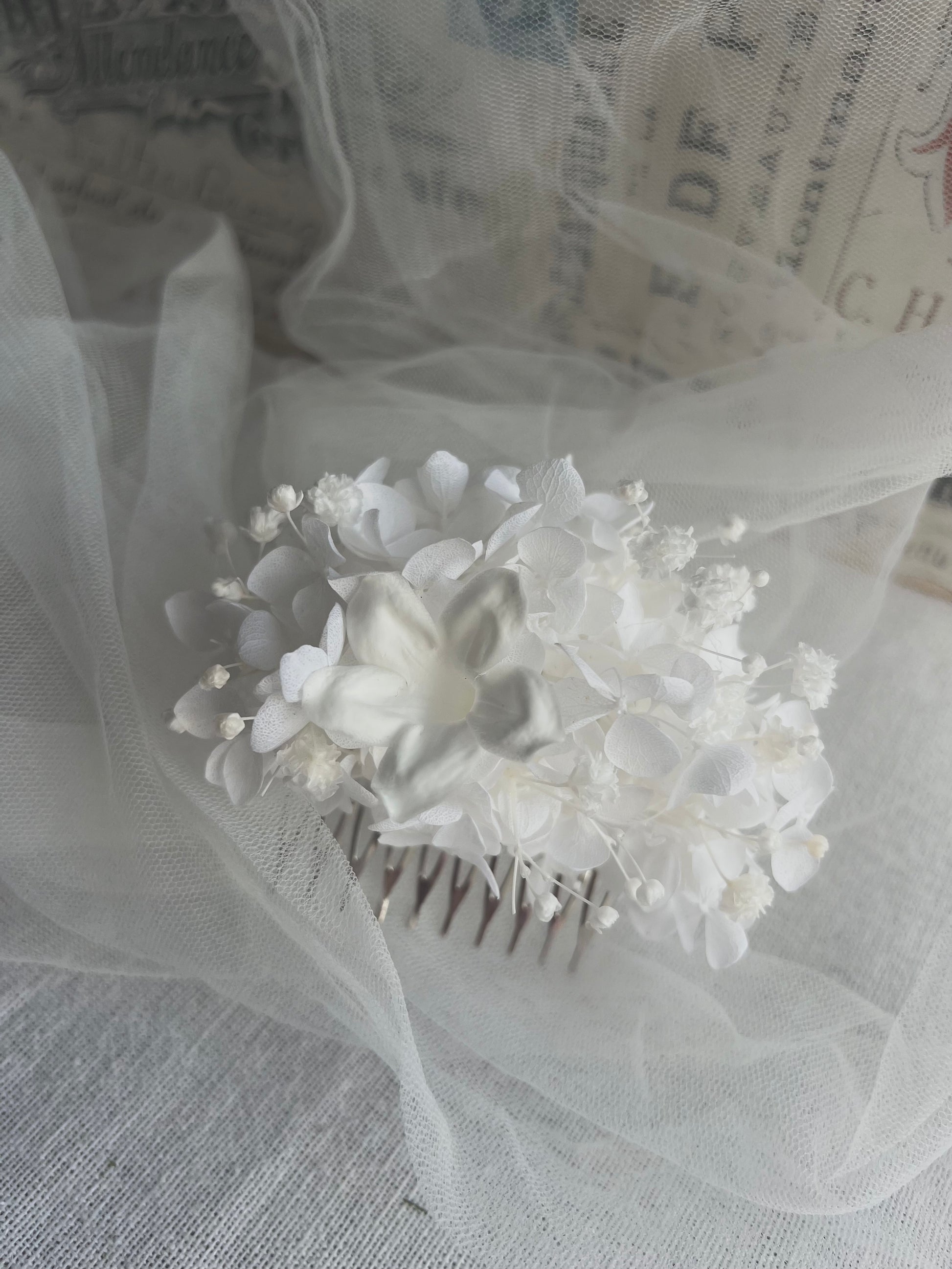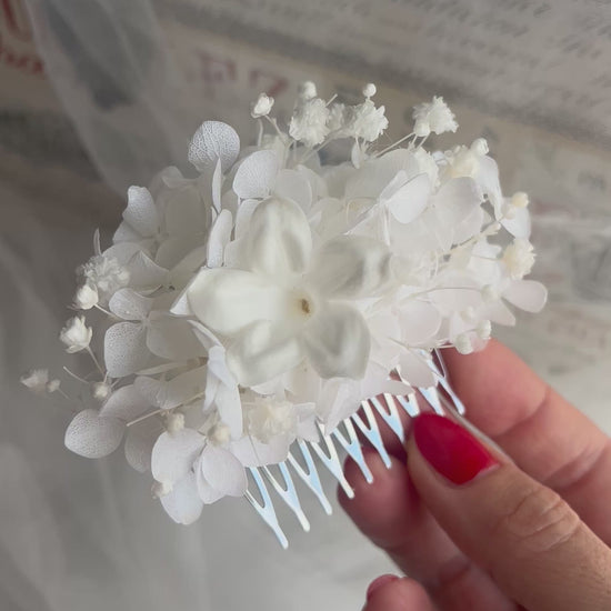 Handmade with preserved jasmine, babys breath (gypsophila) and hydrangeas.