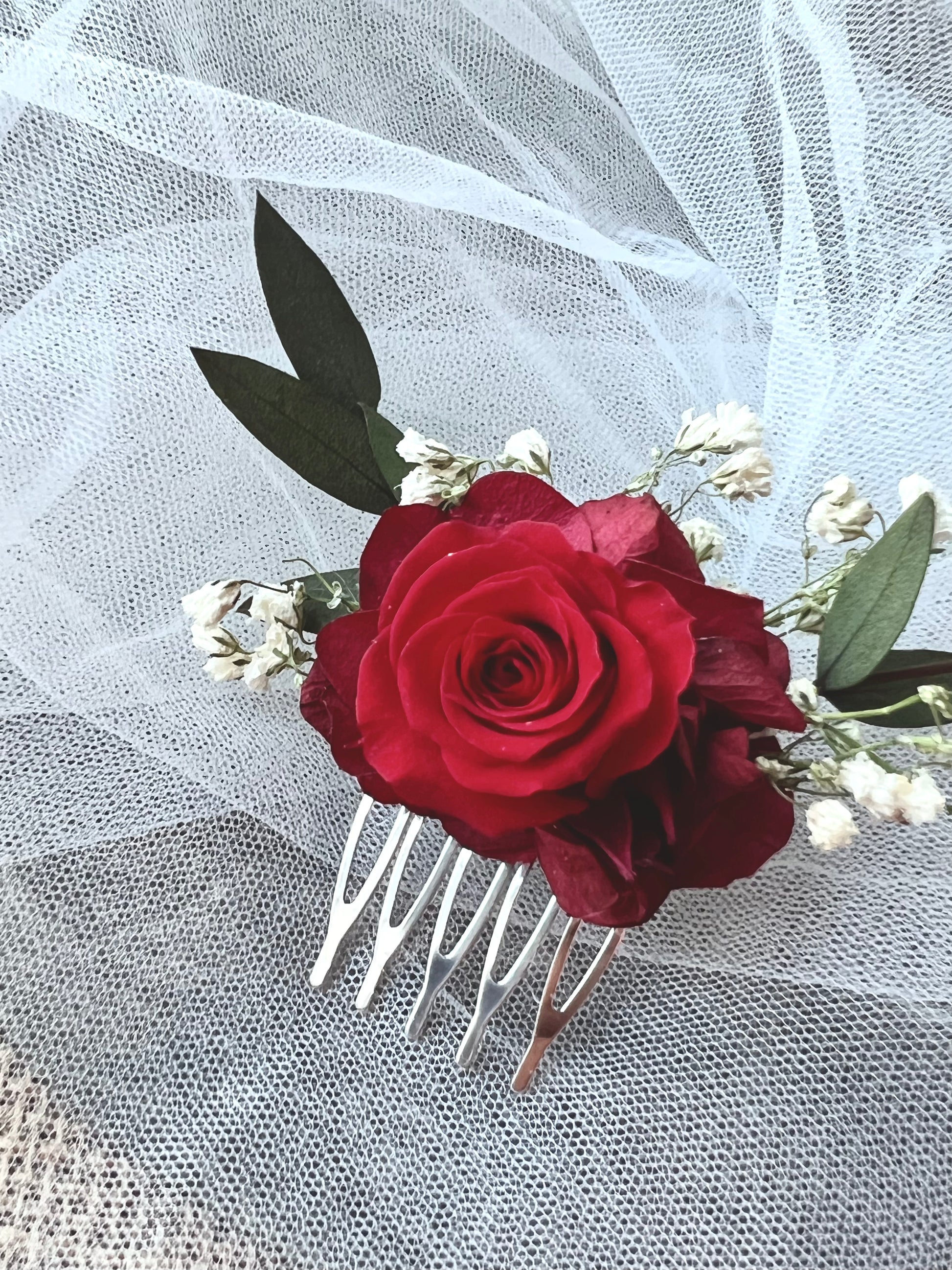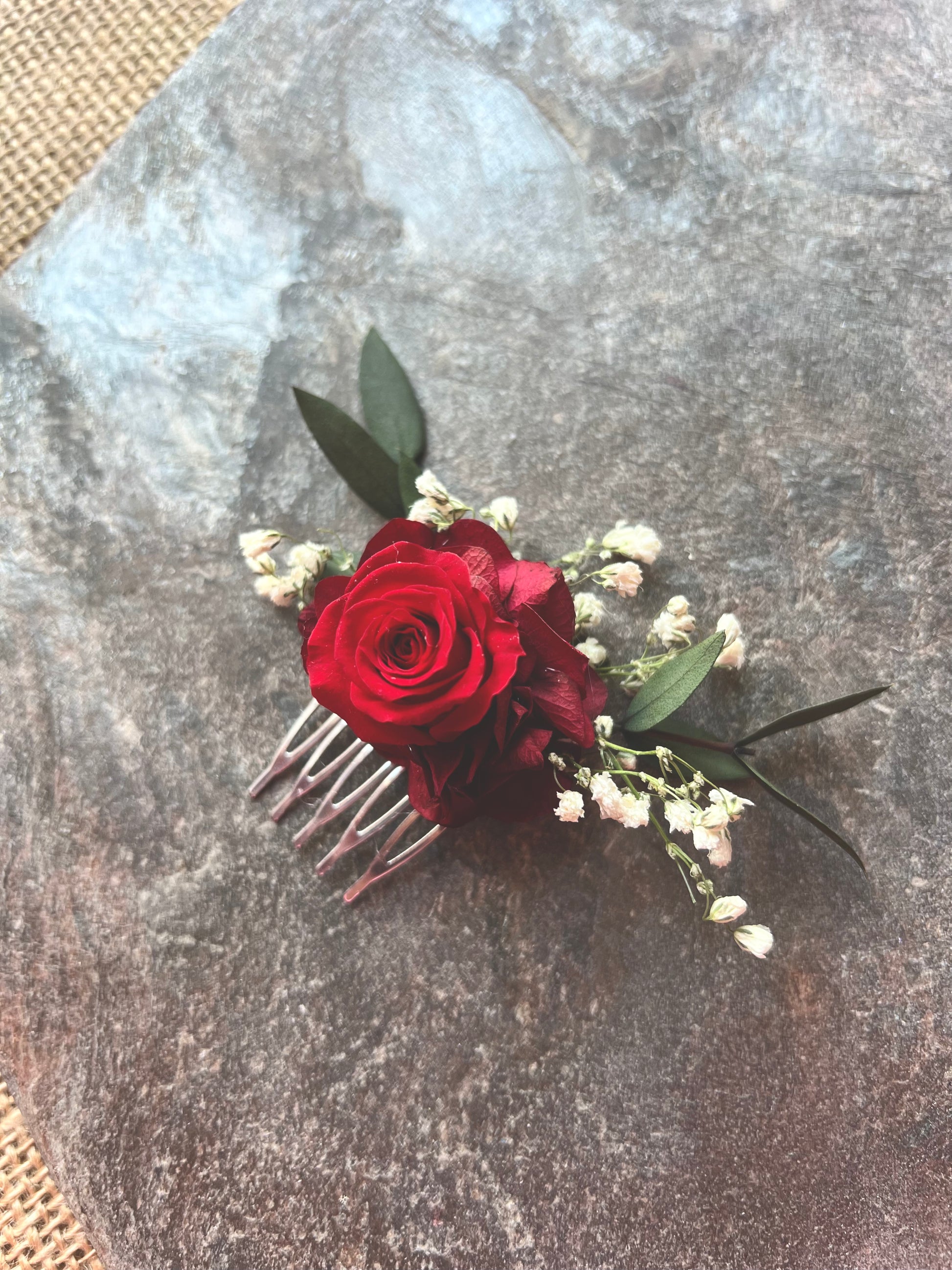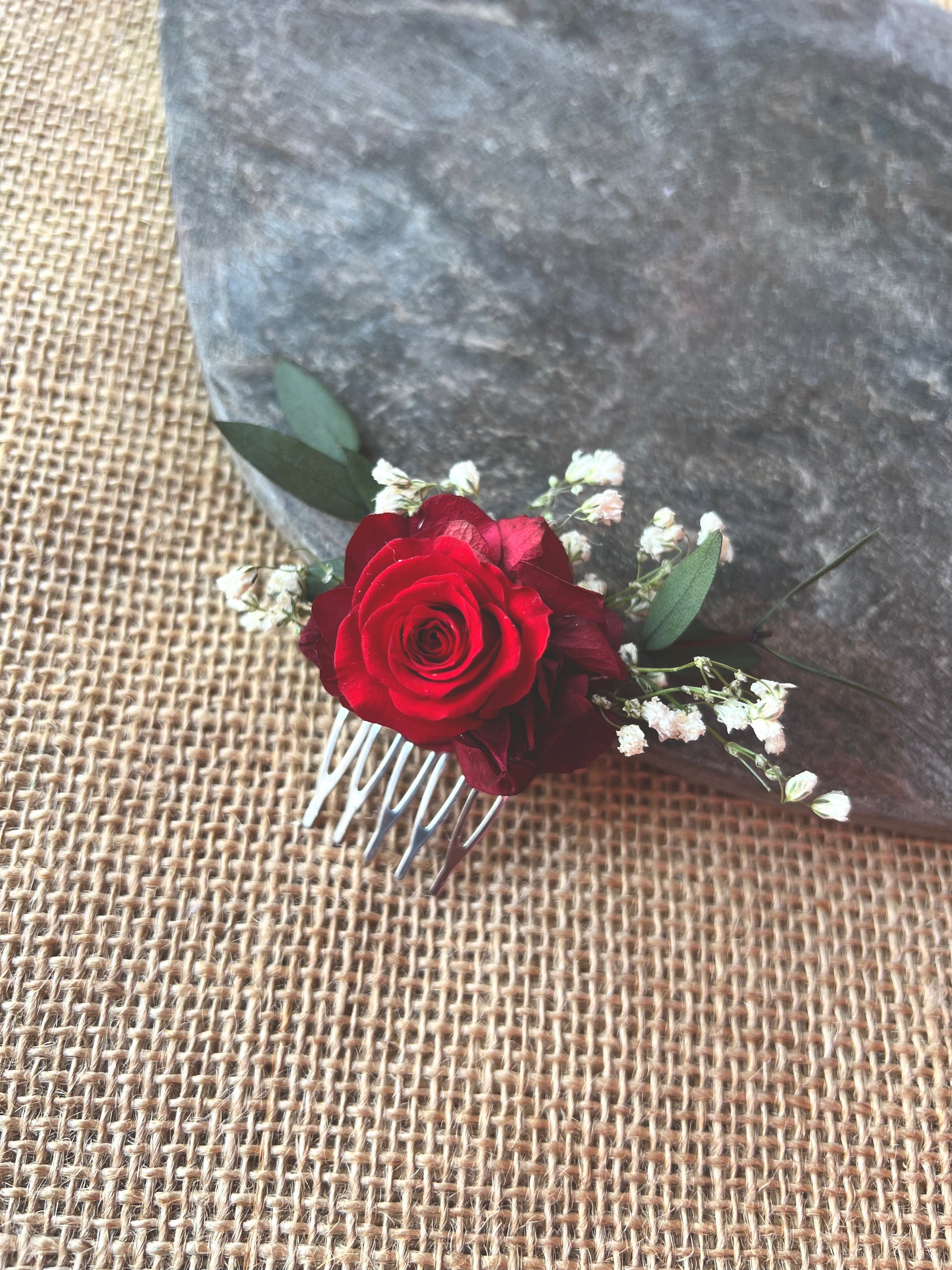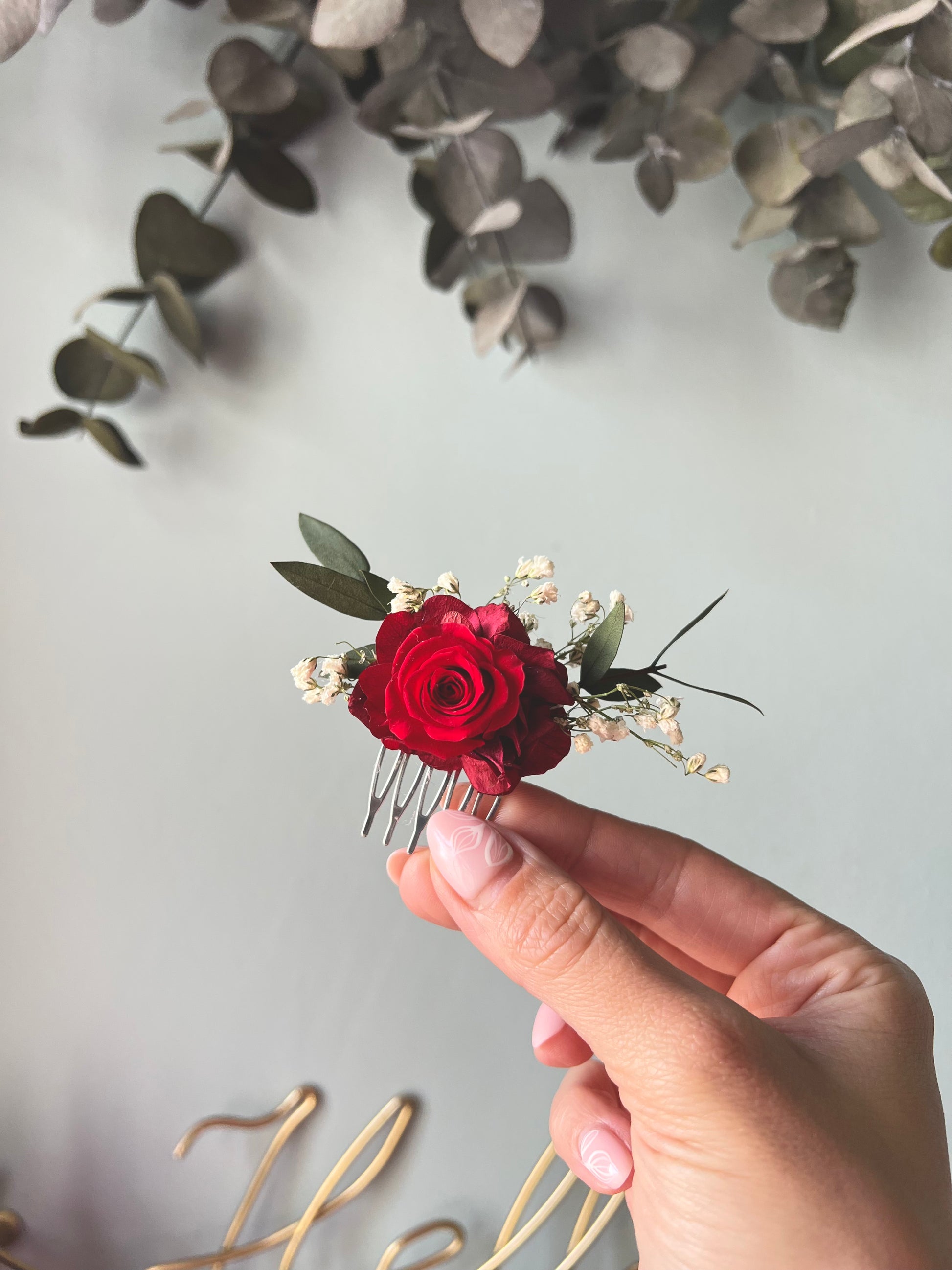 Classic Red Rose Everlasting Bridal Hair Piece, Minimalist Wedding Bridal Dried Flower and Eucalyptus Gypsophila Hair Comb