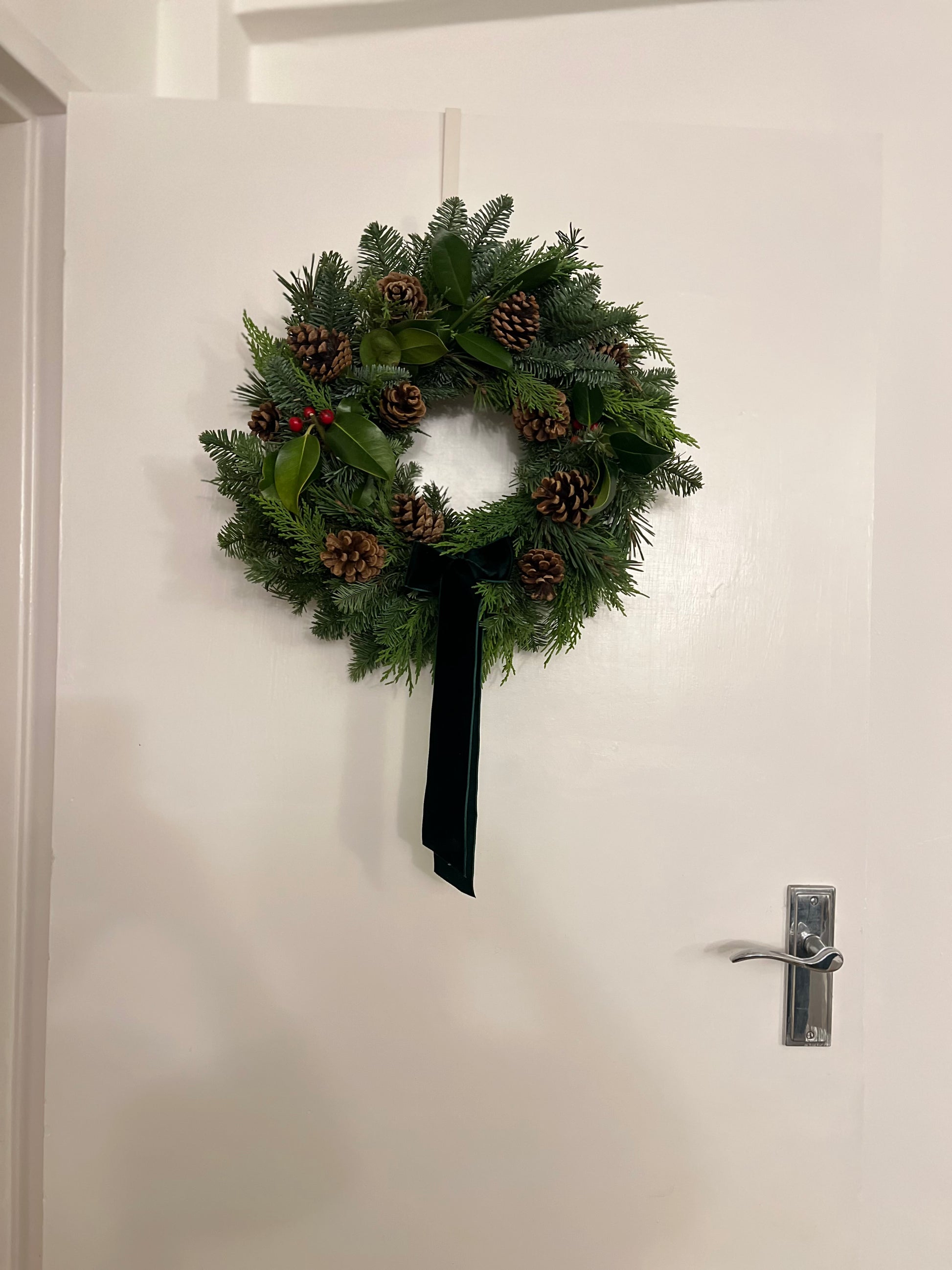 Fresh Christmas Wreath with Holly Red Berries and Pinecones, Green Velvet Ribbon, 45cm