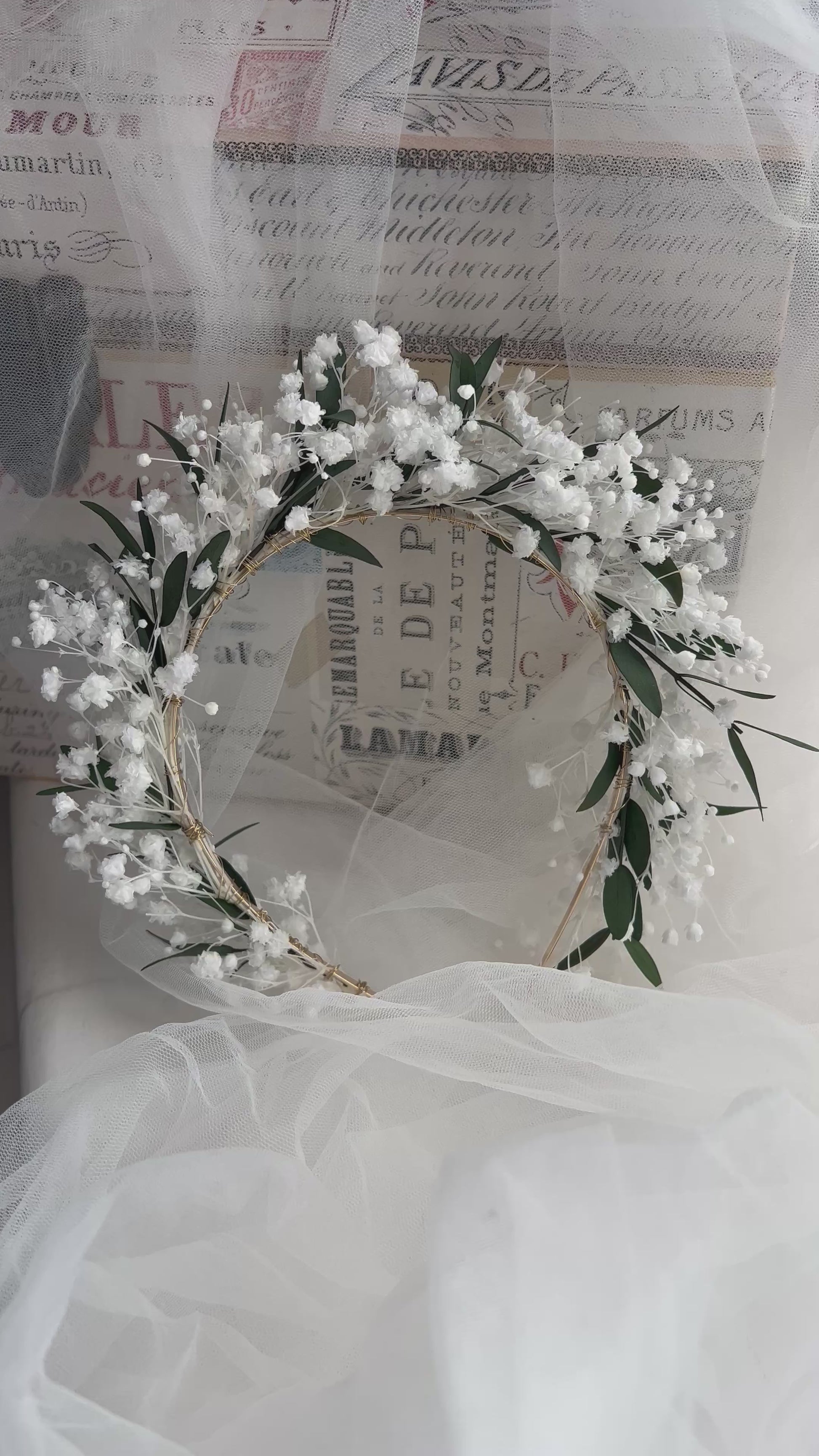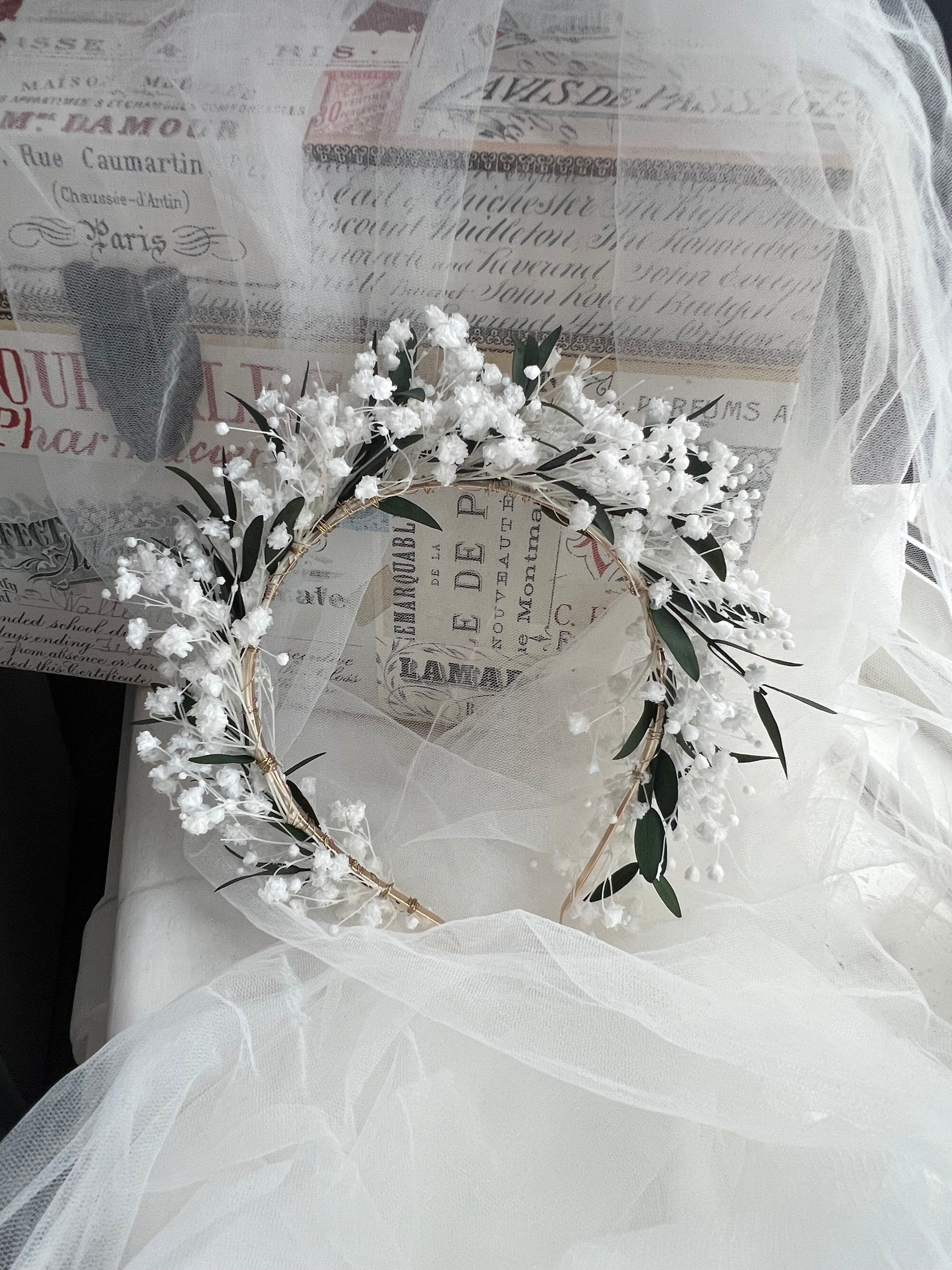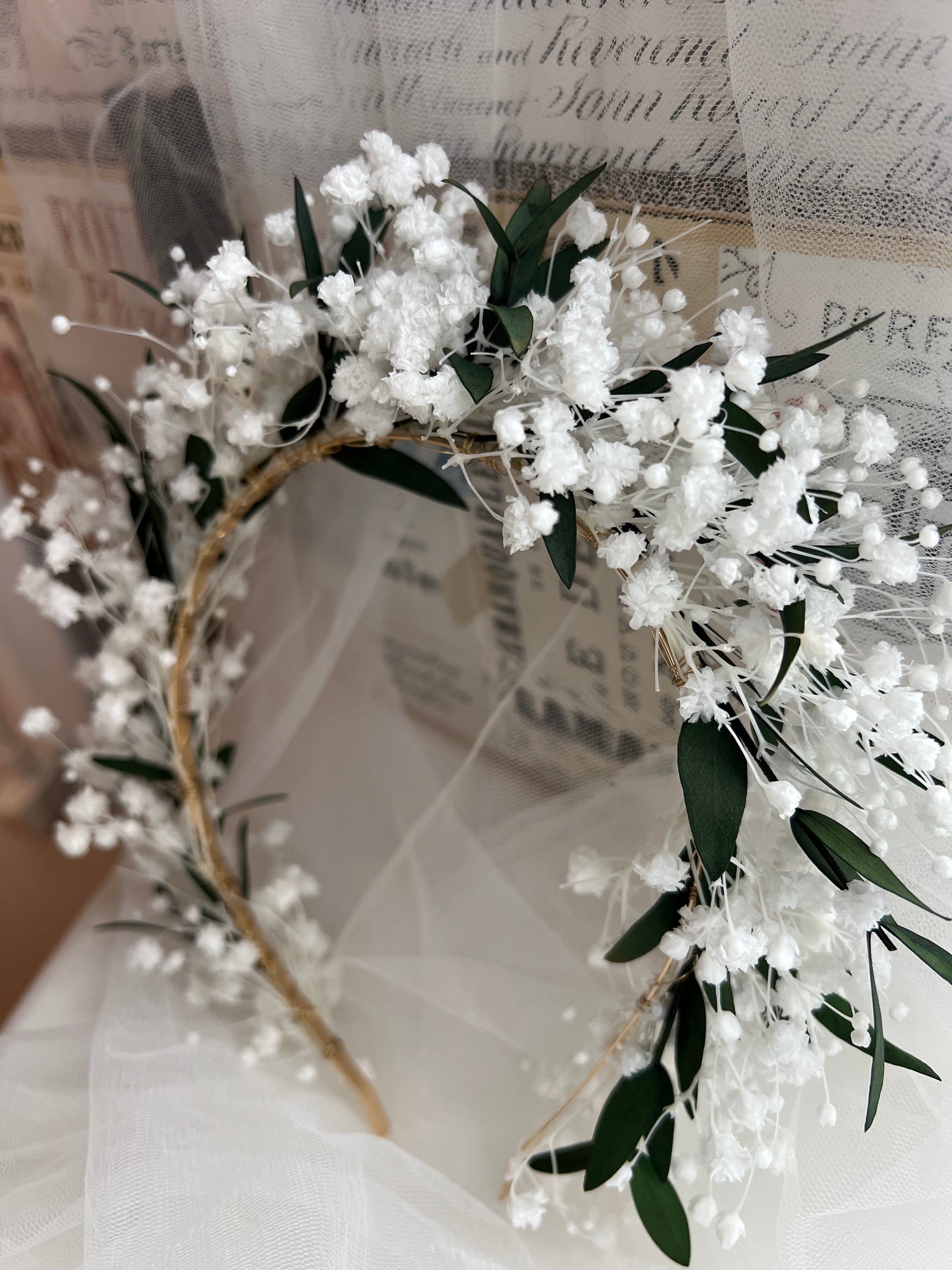 This handmade bridal set features a delicate flower crown and matching hair pins, created with pure white preserved gypsophila (baby’s breath) and elegant eucalyptus leaves. A timeless and nature-inspired accessory for your: