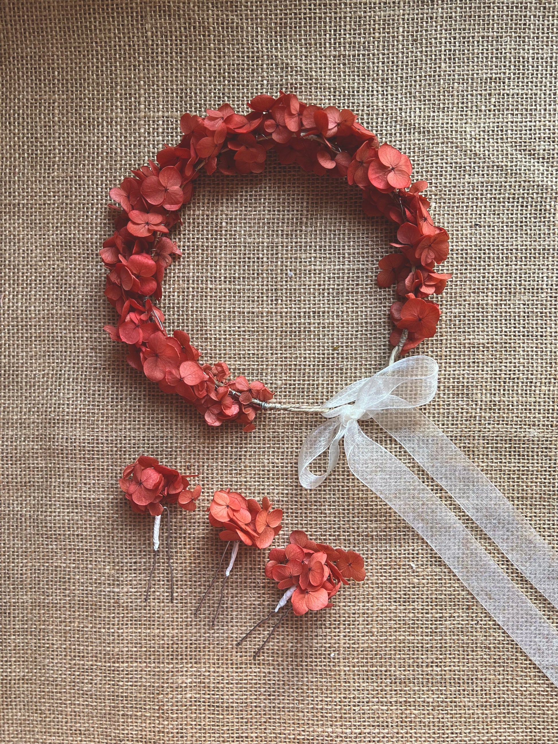 Autumnal Coral Red Orange Flower Crown, Wedding Hair Wreath Flower Girl Headpiece, Coral Red Everlasting Floral Hair Piece, Hydrangea Tiara