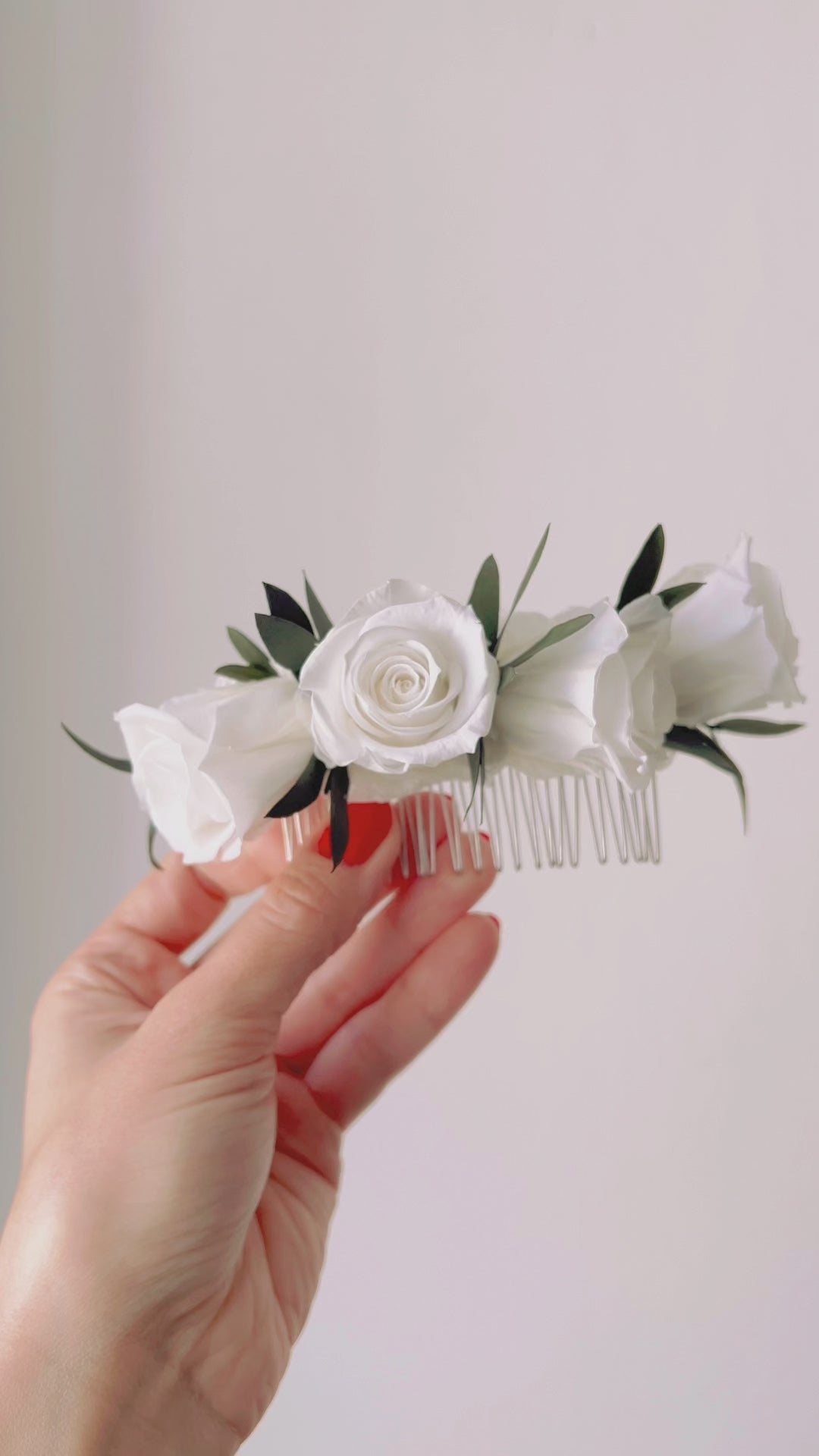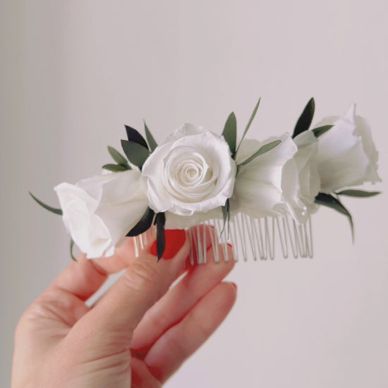 Boho White Rose And Eucalyptus Wedding Hair Comb, White and Green Olive Leaves Flower Comb, Rustic Bridal Wedding Accessories Silver Gold UK
