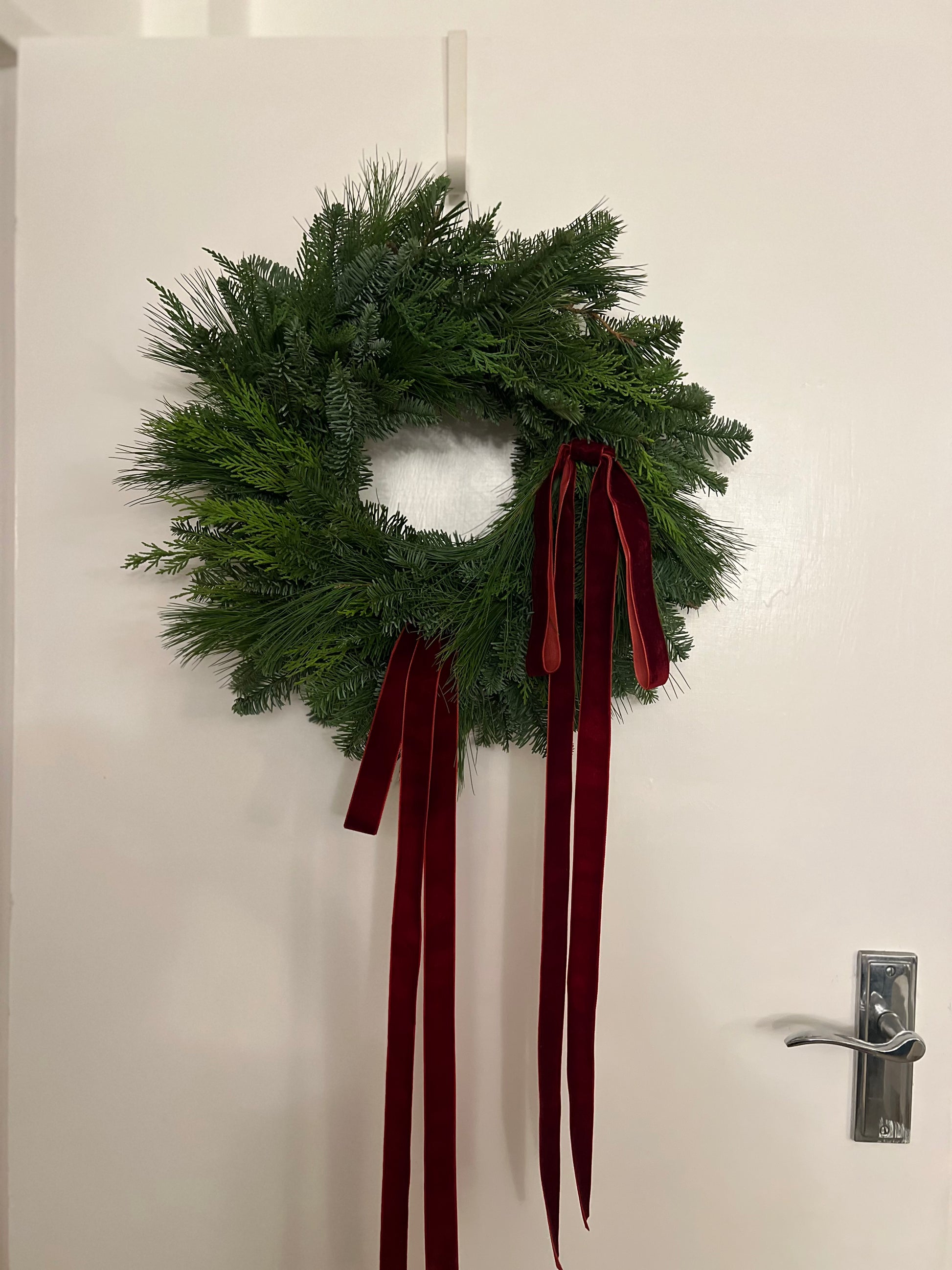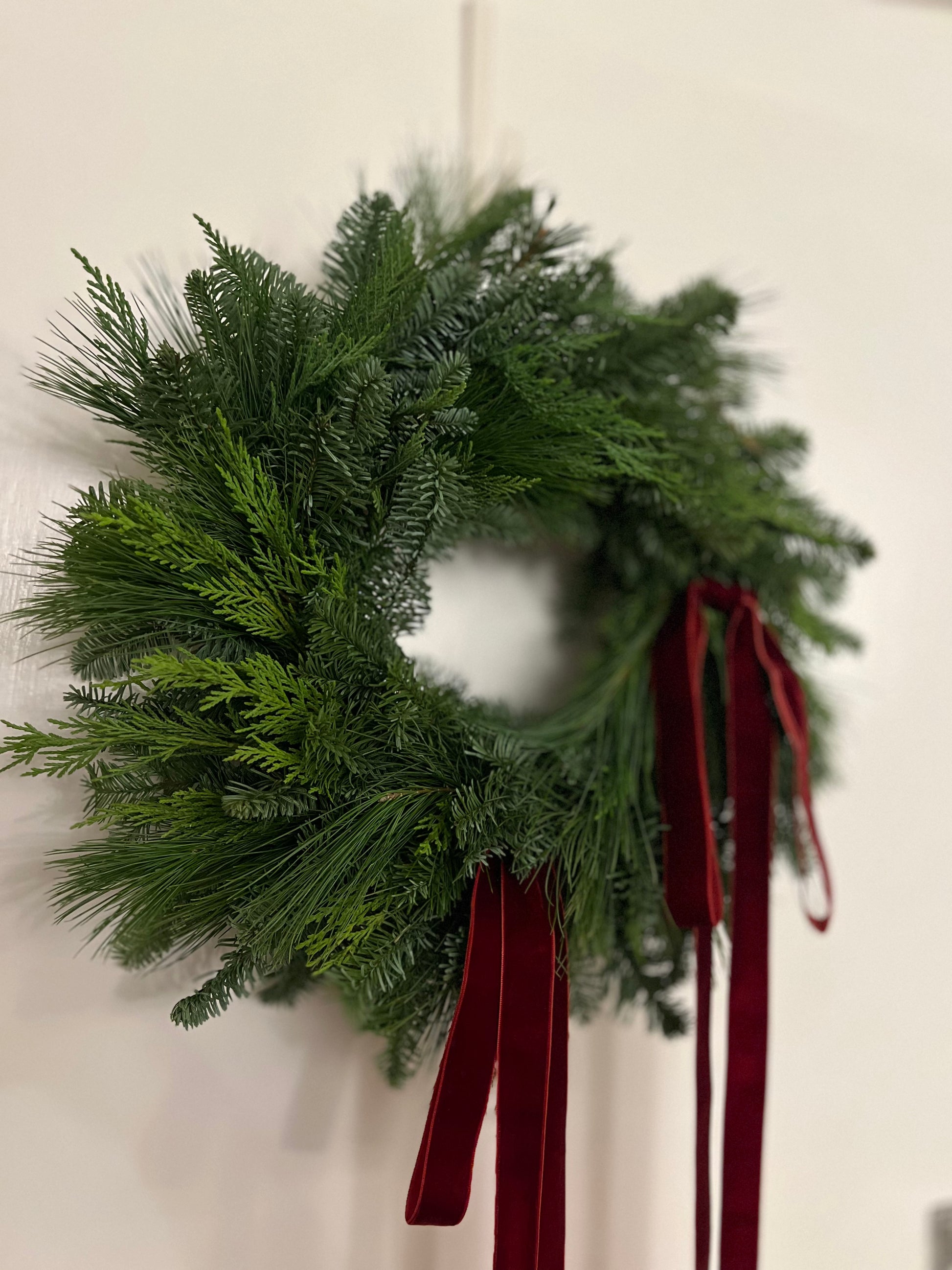 Fresh Modern Christmas Wreath with Velvet Burgundy Ribbons