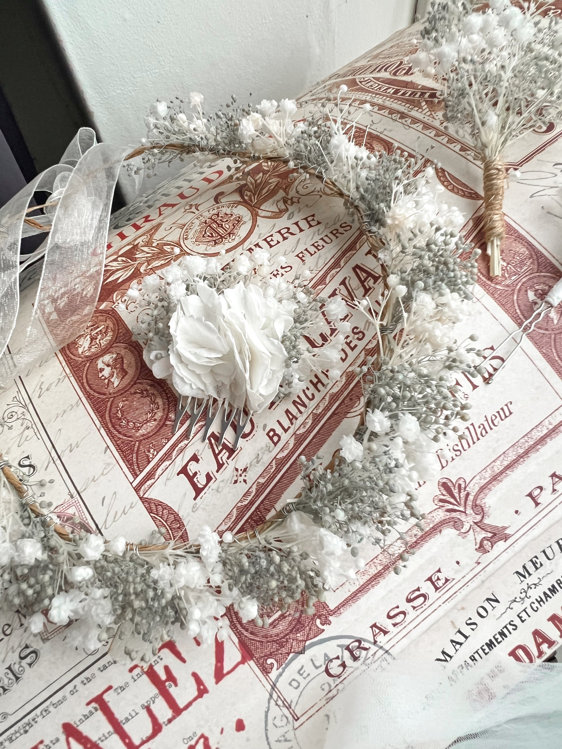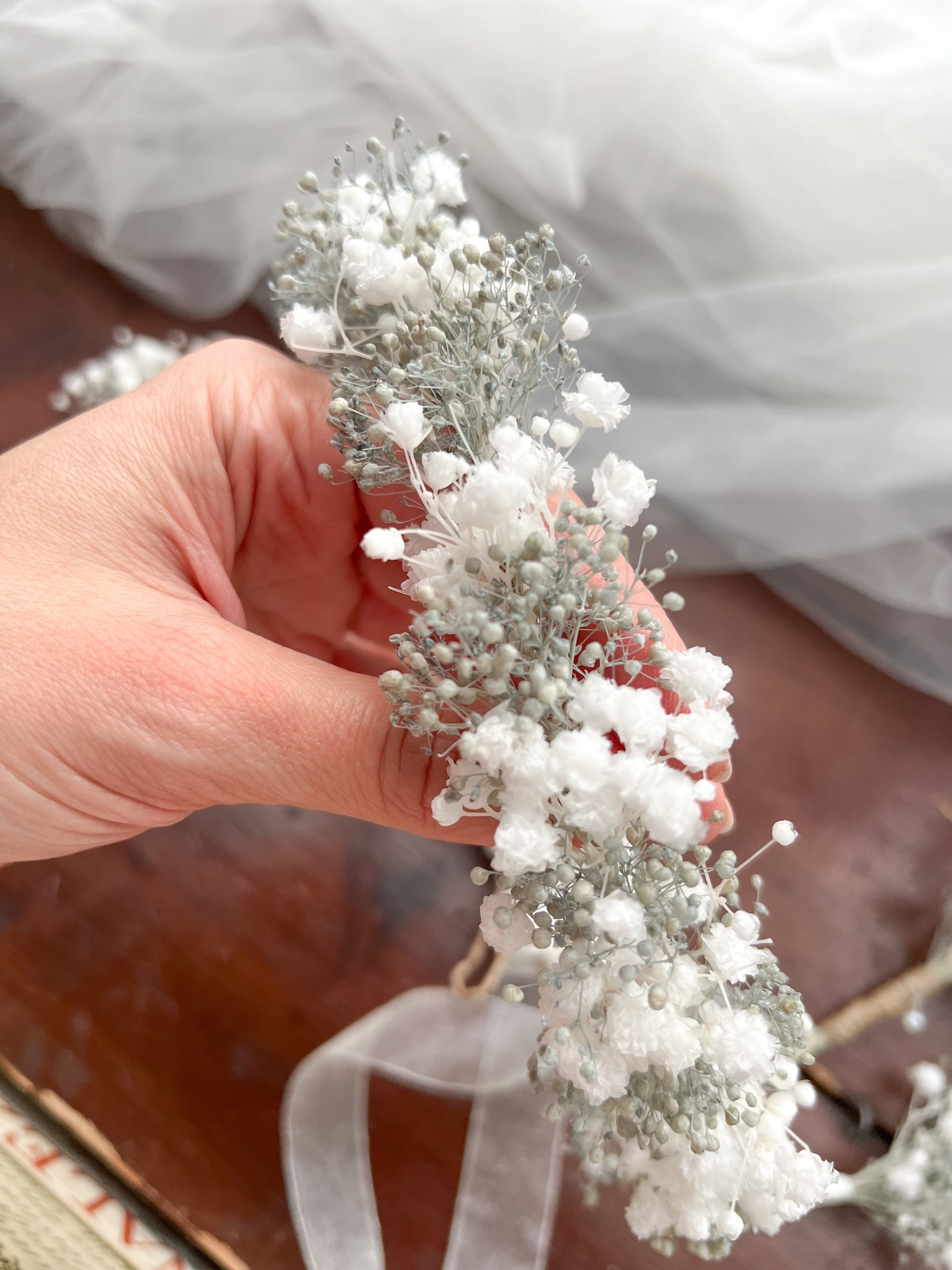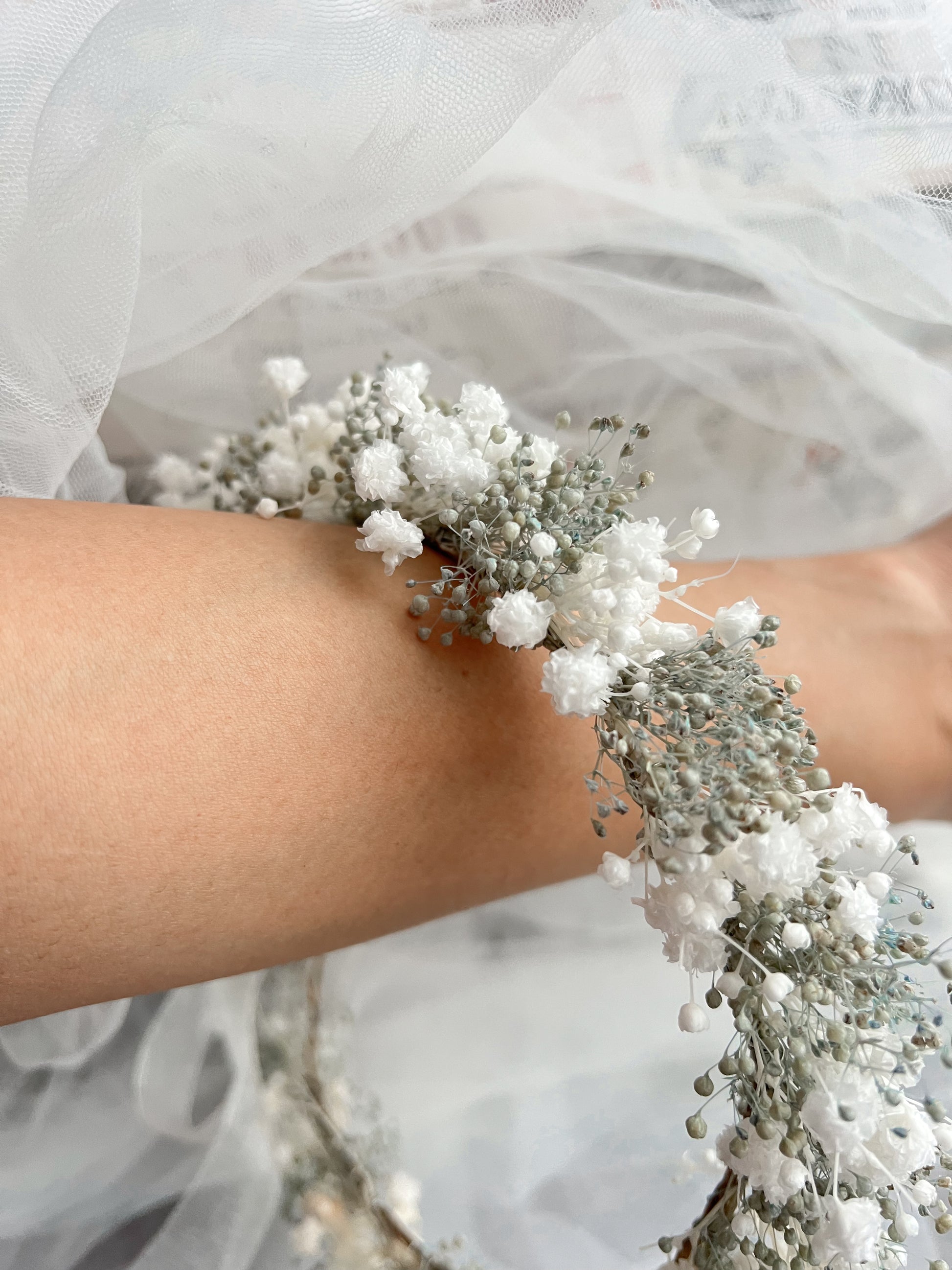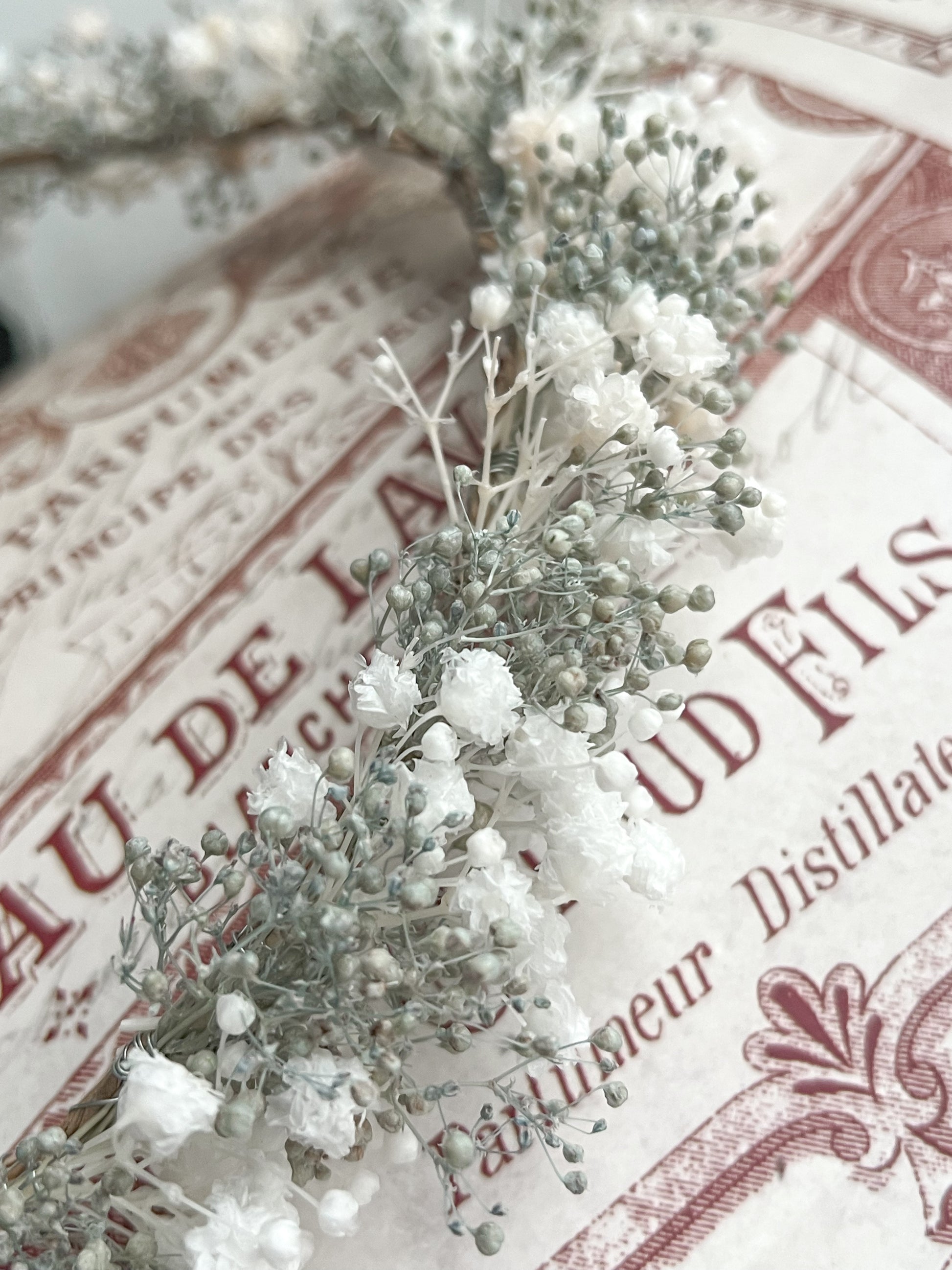Made with natural everlasting baby’s breath (gypsophilas) in white and light greyish blue.