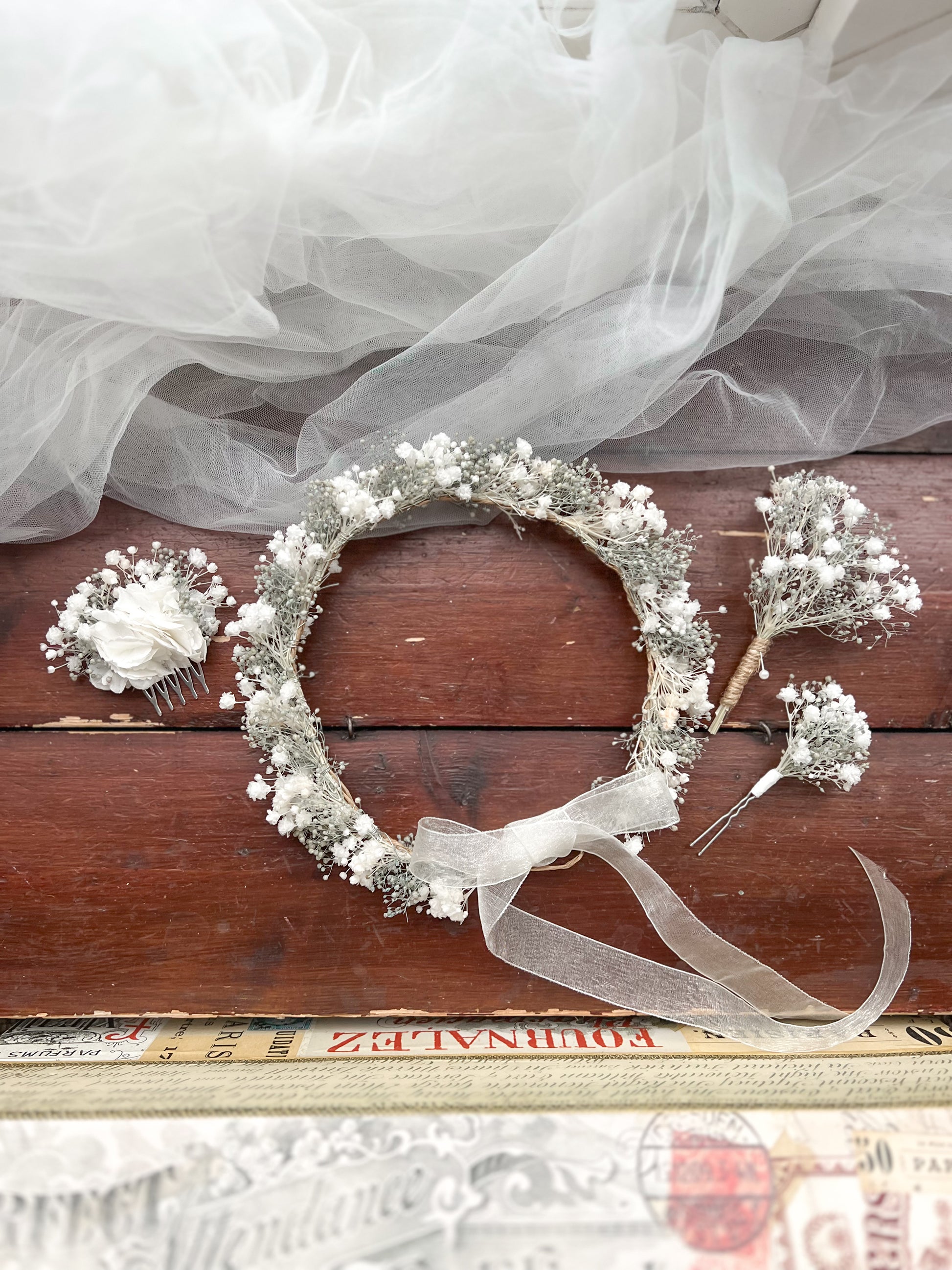 Preserved Gypsophila Headband White and Pale Blue Tiny Flower Crown and Wedding Flowers Set with Boutonniere, Babys Breath Hair Pins